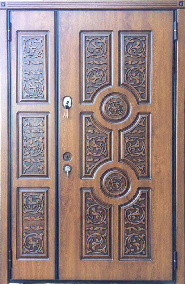Хорошие атмосферостойкие свойства корабельной фанеры позволяют использовать ее для отделки металлических дверей. Внешне корабельная фанера ничуть не уступает накладкам из массива, но, в отличии от них, более легкая, долговечная, устойчива к перепадам влажности и температуры, не рассыхается, менее подвержена деформации и не имеет так называемого «эффекта памяти», то есть, в отличии от накладок из массива, не старается «вернуться» в исходное положение. По стоимости двери из корабельной фанеры находятся в одном ценовом диапазоне с дверями, сделанными с использованием массива. Ввиду высокой плотности материала, фрезеровка выполняется специальными фрезами, что дает возможность изготовить дверь под любой интерьер и по любому эскизу. А вот вручную нанести фрезеровку на корабельную фанеру не получится – таковы особенности этого материала.