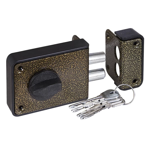 Замок накладной ЗН 1-3-1 предназначен для деревянных и металлических дверей. Корпус замка выполнен из ударопрочного АБС-пластика со стальной пластиной, ригели из стали. Имеется блокировка открывания двери ключом снаружи. Изнутри замок запирается ручкой. 2 класс секрета. Количество секретных комбинаций: 15 000. Два ригеля диаметром 14 мм. Цвет: бронза. Комплектация: замок, цилиндровый механизм МЦ-1, 4 английских ключа, ответная планка, 1 накладка, крепежная фурнитура.